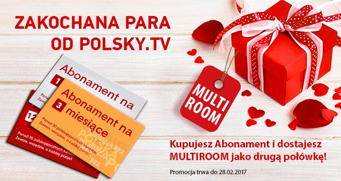 Walentynki - najbardziej romantyczne święto i chcemy spędzić go z Wami. Dlatego przygotowaliśmy zakochanym i nie tylko, niespodziankę. Kupując jakikolwiek z naszych abonamentów, otrzymacie Multiroom w prezencie, co daje możliwośc ogłądać telewizję na kilku urządzeniach jednocześnie.