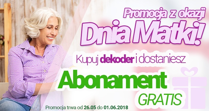 Dzień mamy już niedługo i Polsky.TV przygotował dla was promocję.Z okazji Dnia Matki oferujemy 15% zniżki w sklepie Polsky.TV.Wszystkie abonamenty, dekodery, opcje Przedłużenie oraz Multiroom uczestniczą w promocji.*Promocja trwa od 26.05.2020 godz. 8:00 do 29.05.2020 godz. 8:00 czasu polskiego.*Dystrybutorzy biorą udział w akcji promocyjnej na warunkach specjalnych.